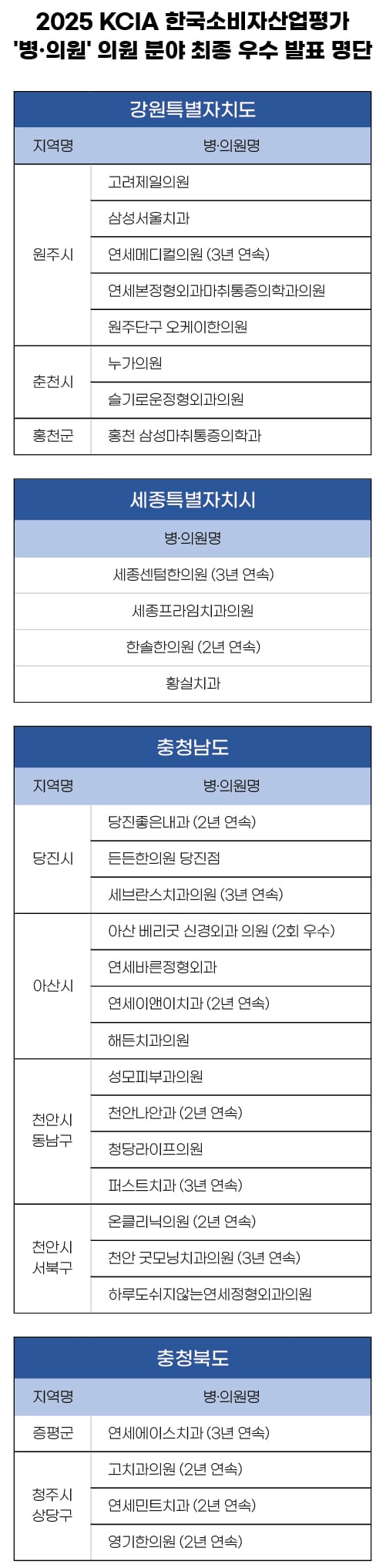 KCA한국소비자평가는 대한소비자협의회가 주최하고 한국소비자평가가 주관하는 <2025 KCIA 한국소비자산업평가 ‘병ㆍ의원’> 의원 분야 강원, 세종, 충청 지역 평가 결과를 발표했다.