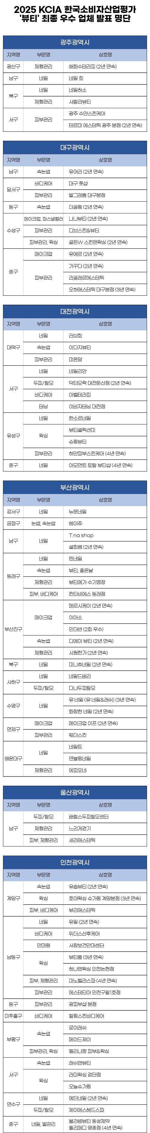 KCA한국소비자평가가 대한소비자협의회 주최, 한국소비자평가 주관 '2025 KCIA 한국소비자산업평가 뷰티' 광역시(광주, 대구, 대전, 부산, 울산, 인천) 지역 평가 결과를 발표했다고 19일 밝혔다.