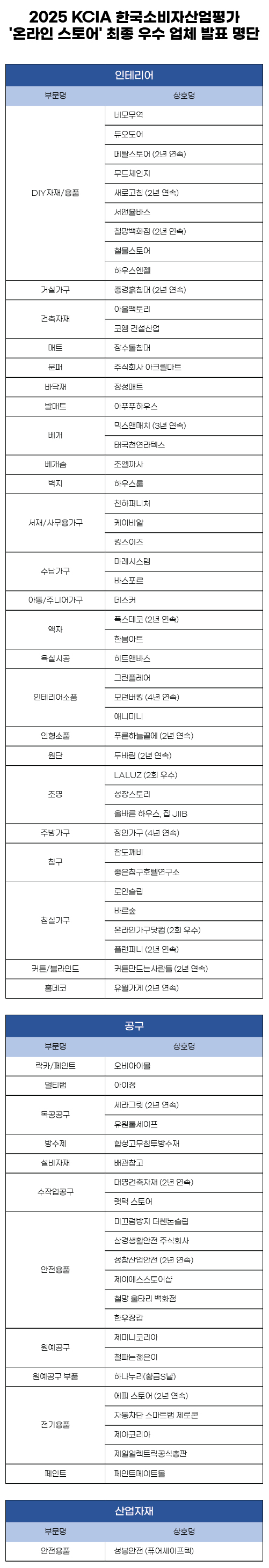 2025 KCIA 한국소비자산업평가 ‘온라인 스토어’ 인테리어, 공구, 산업자재 분야 평가 결과 발표
