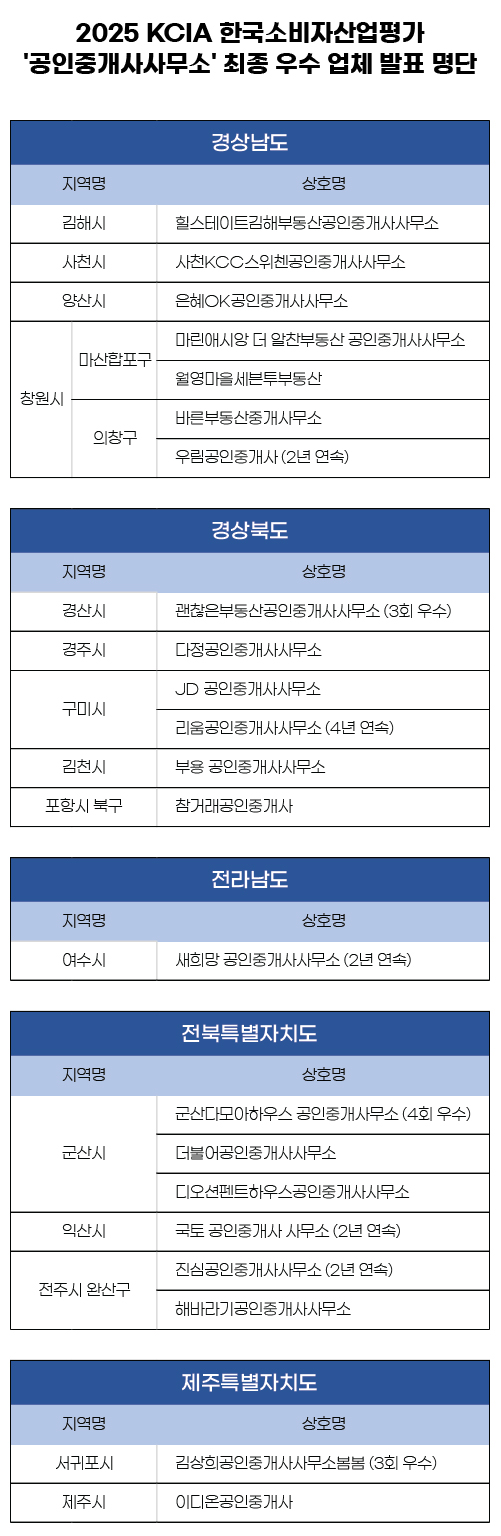 2025 KCIA 한국소비자산업평가 ‘공인중개사사무소’ 경상, 전라, 제주 지역 결과 발표