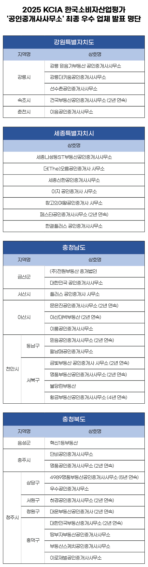 2025 KCIA 한국소비자산업평가 ‘공인중개사사무소’ 강원, 세종, 충청 지역 결과 발표