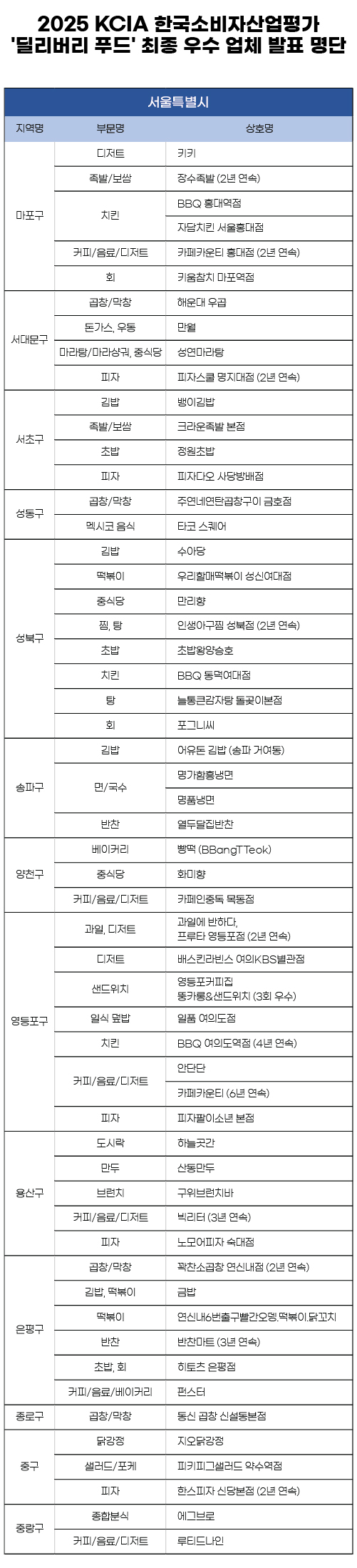KCA한국소비자평가는 대한소비자협의회가 주최하고 한국소비자평가가 주관하는 <2025 KCIA 한국소비자산업평가 ‘딜리버리 푸드’> 서울 마포, 서대문, 서초, 성동, 성북, 송파, 양천, 영등포, 용산, 은평, 종로, 중랑, 중구 지역 평가 결과를 발표했다.