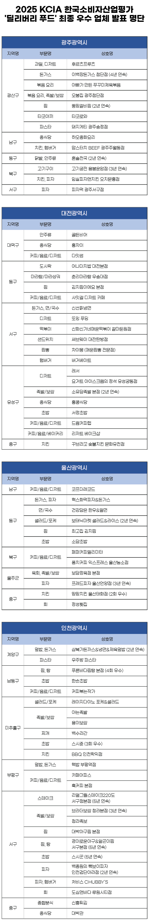 2025 KCIA 한국소비자산업평가 ‘딜리버리 푸드’ 광주‧대전‧울산‧인천 지역 결과 발표