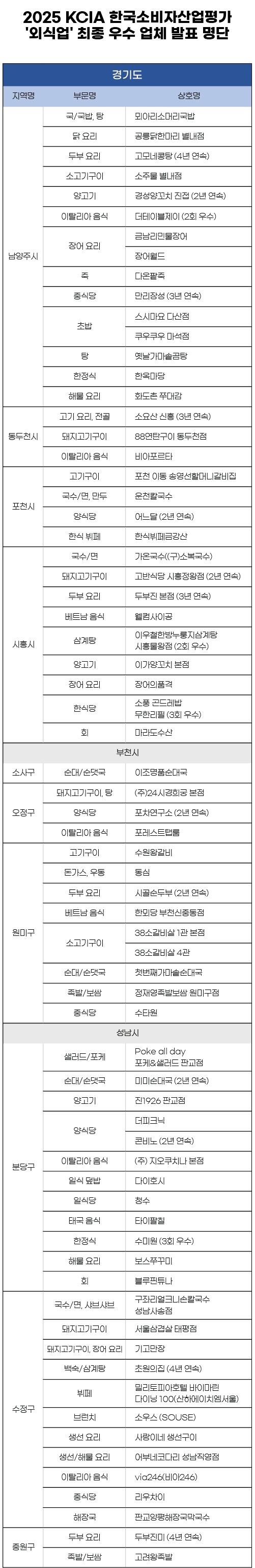KCA한국소비자평가는 대한소비자협의회가 주최하고 한국소비자평가가 주관하는 ‘2025 KCIA 한국소비자산업평가 – 외식업 부문’의 경기 남양주, 동두천, 포천, 시흥, 부천, 성남시 지역 평가 결과를 발표했다고 밝혔다.