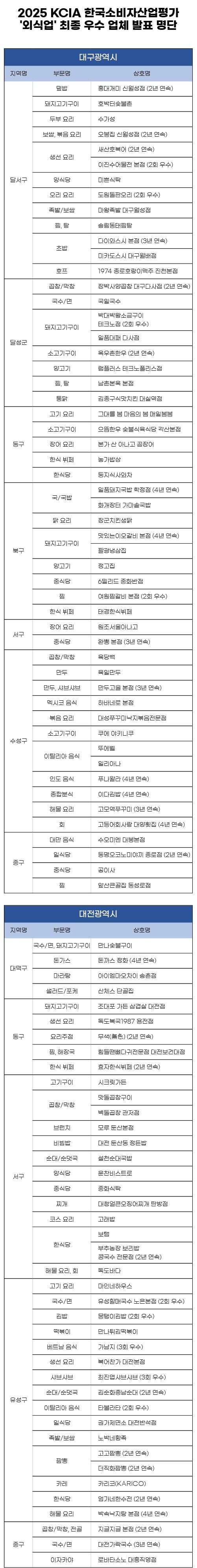 KCA한국소비자평가는 대한소비자협의회가 주최하고 한국소비자평가가 주관하는 <2025 KCIA 한국소비자산업평가 ‘외식업’> 대구, 대전 지역 평가 결과를 발표했다.