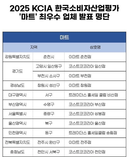 KCA한국소비자평가는 대한소비자협의회가 주최하고 한국소비자평가가 주관하는 <2025 KCIA 한국소비자산업평가 ‘마트’>의 선행 평가를 통해 선정된 최우수 마트 명단을 발표했다.