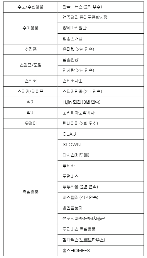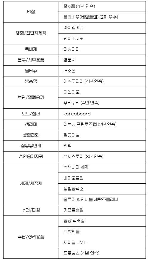 한국소비자평가는 해당 온라인 스토어를 이용한 소비자들의 실제 경험을 바탕으로 최종 평가를 거쳐 △제품 만족도 △배송 만족도 △컴플레인 응대 △전반적 평가 총 4가지 최종 평가 기준에 따라 세부 분야 및 부문별 우수 온라인 스토어를 선정하였으며 발표 명단은 다음과 같다.